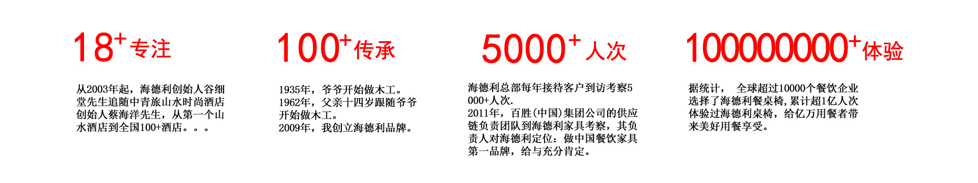 從歐美發(fā)達市場到東南亞乃至非洲等新興市場,超過100000個餐飲品牌及餐飲連鎖店,都在使用海德利家具,給您信心保證。